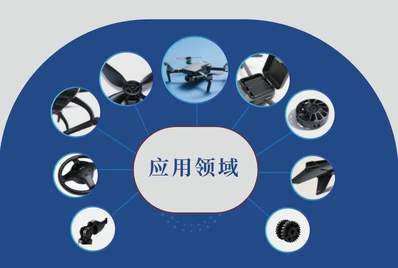 无人机的机身框架、机翼、螺旋桨、货舱、起落架、座椅支架、仪表盘、电池舱、电控外壳、旋翼,机器人零部件、工业设备外壳、服务器机柜零部件、智能终端设备外壳及配件、汽车零部件、家电、电动工具、军工部件、航空航天、新能源、电力风能、运动器材、机械配件、高端鞋材等领域。