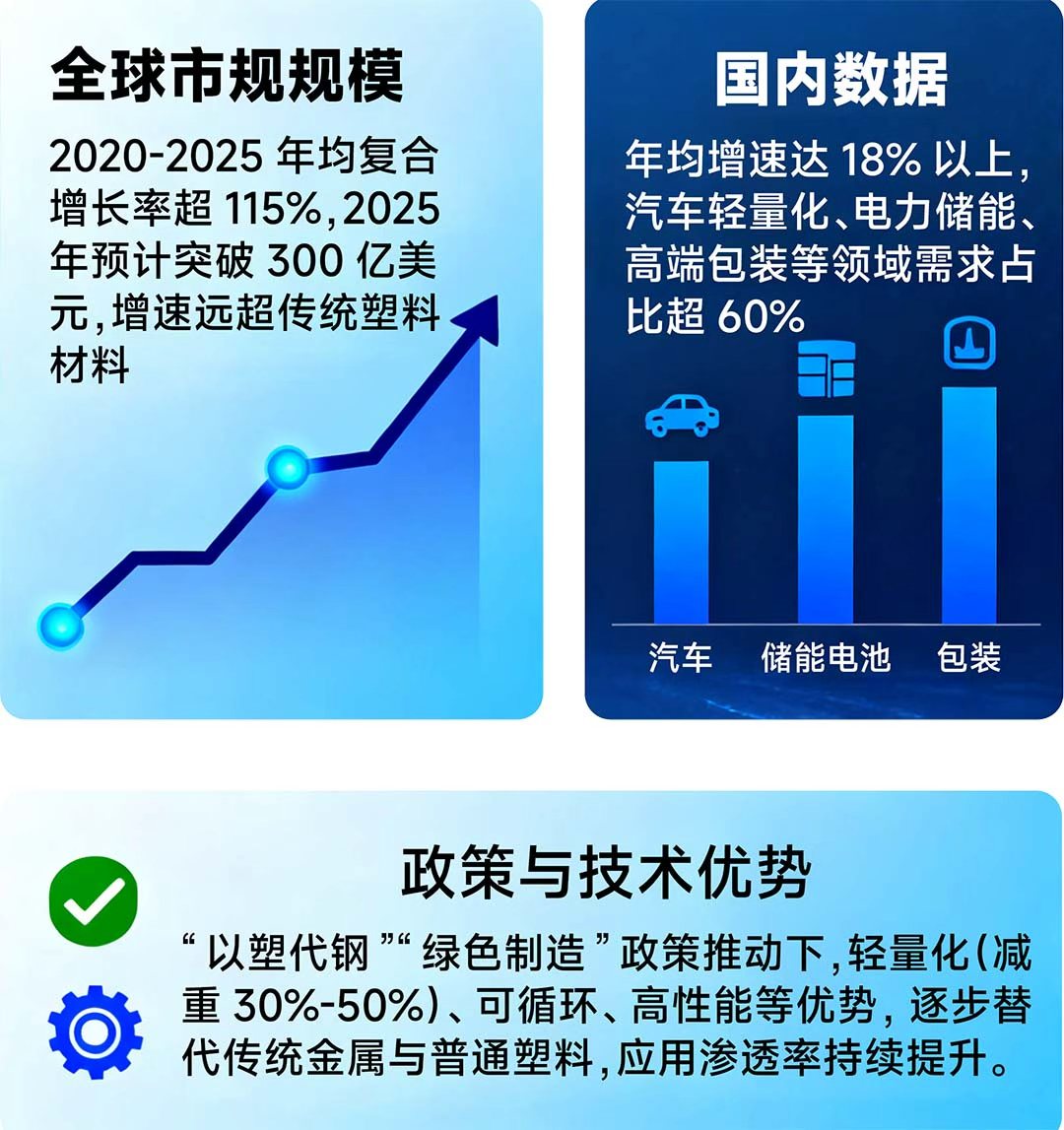 在“双碳”目标推动的轻量化浪潮下,LFT(长纤维增强热塑性复合材料)市场正迎来爆发性增长。预计到2025年,其全球市场规模将突破300亿美元,年均复合增长率(CAGR)保持在8%以上。中国作为全球核心,以占据60%以上的产能,正引领该领域的创新与应用。