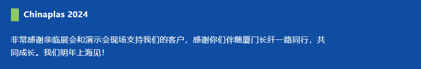 短短四天的Chinaplas 2023之旅结束了,感恩所有相遇!在广大客户的信任与支持下,厦门长纤始终秉承“质量优先,客户至上,开拓创新求发展”的运营方针帮助客户创造更高性能的材料,厦门长纤希望用其独特的生产经营理念成为行业的领头羊,继而推动整个行业的发展进步。