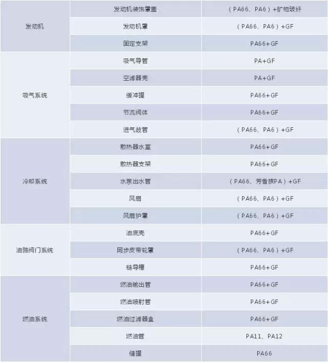 PA中PA6和PA66用量占总量的90%以上,在汽车上的应用比例也是如此,由于PA11和PA12具有良好的柔软性,耐油性,耐腐蚀性,耐候性,低温韧性,耐水性,尺寸稳定性,在汽车的输油管,制动管,刹车片,油箱外壳,液压容器等方面有广泛应用。用于汽车的PA材料大多需要经过改性,其中填充改性、增强改性的用量最大,另外EPDM、POE增韧改性尼龙材料也有较多的应用。最近几年的改进趋势是增加尼龙材料的流动性、耐热性、无卤阻燃等性能。